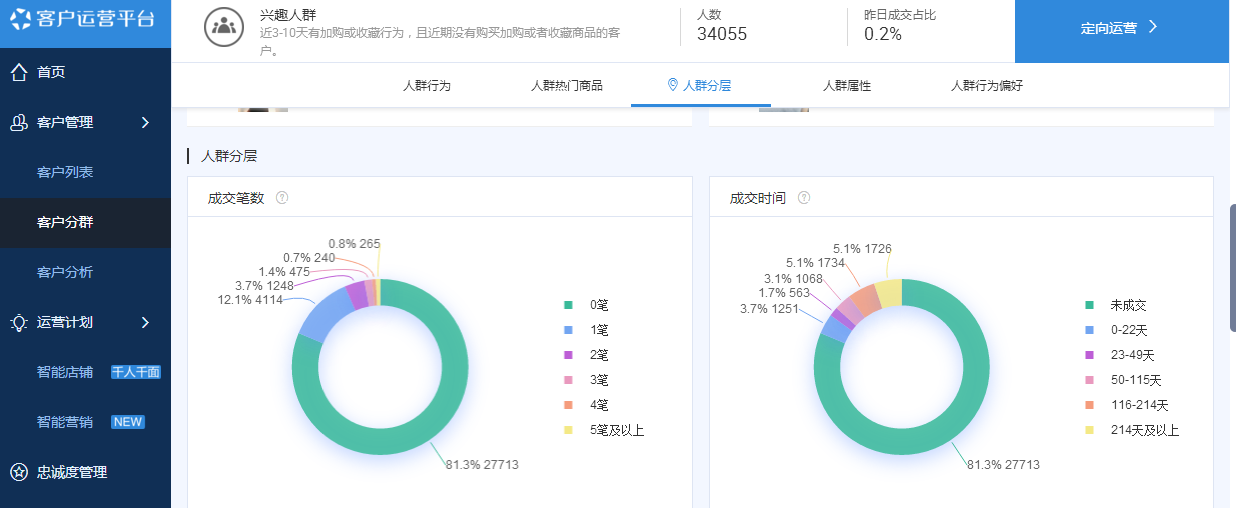 通过客户分析我们也已了解到客户各种细节的标签,对症下药也就更加容易见效。从不同人群在店铺的行为数据(访问、加购收藏、成交)可以识别什么人群是具有高转化潜力,或高成交额贡献的人群,可对他们进行重点运营;