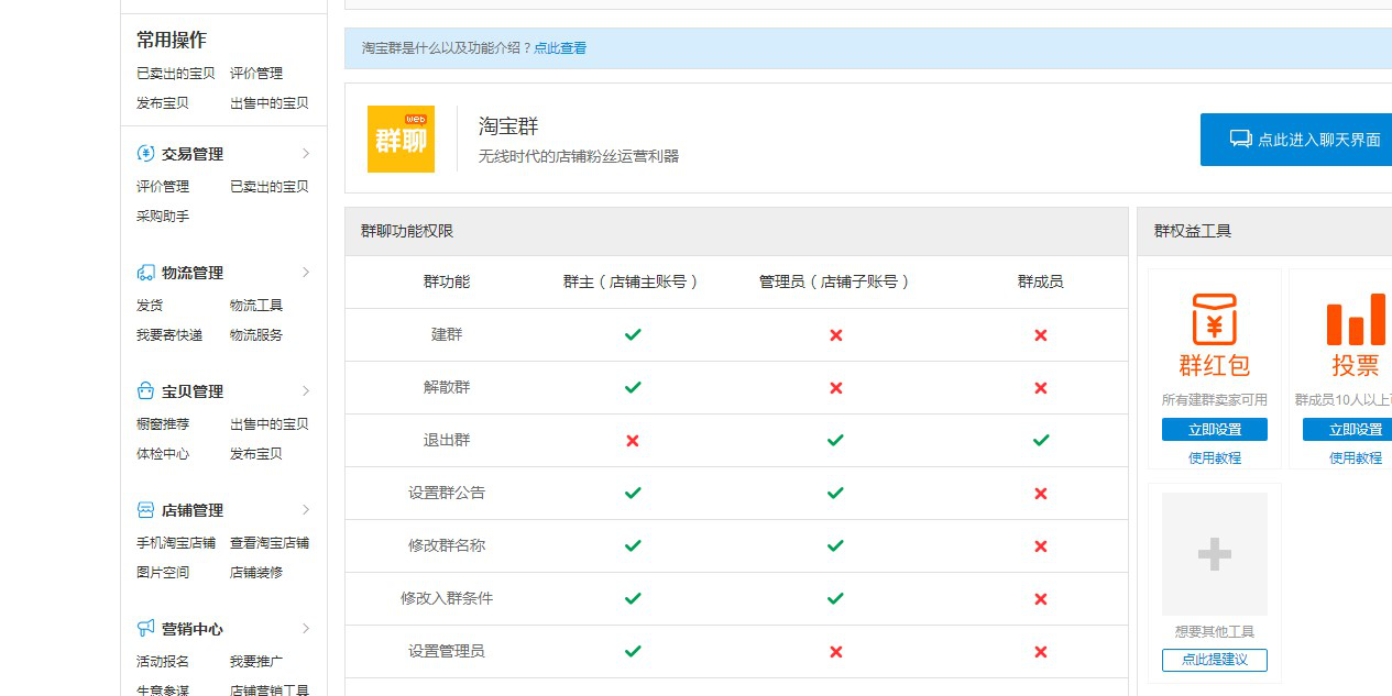 然后我们就可以有一个自己的旺旺群了,在群里我们可以维护自己的老客户,里面有一些发红包、抽奖、拼团的设置,设置之后发布在群聊中。这样能够增加商家与买家的互动。创建了淘宝群之后它会在哪里显示呢?除了我们点击pc端的群聊可以看到群之外,它还在无线端的旺旺聊天窗口里可以看到我们创建的群。