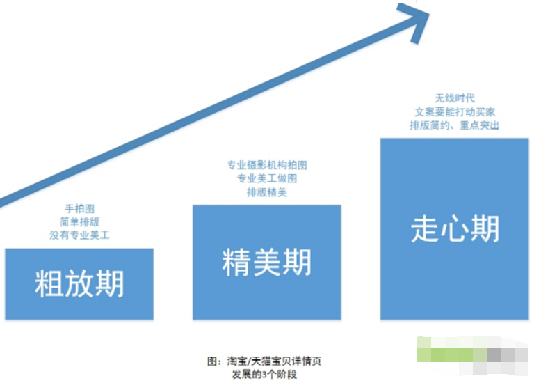 随着淘宝/天猫平台市场的快速增长,商家越来越多,一批有资源的商家优先做出专业拍摄、专业美工制图的宝贝详情页,引发了几乎所有商家追求宝贝详情页的精美。这一阶段精美的宝贝详情页,能做到很高的转化率。