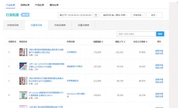 手淘搜索流量高的宝贝应该怎么看呢?工具是生意参谋专业版-市场-商品店铺榜-流量商品榜-按照搜索人气排序。