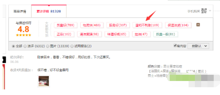 举个例子,这个宝贝评价一共8万多条,你就能挖掘出买家的几个消费痛点: