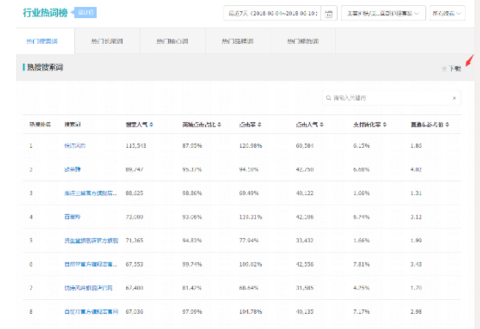 如图所示,下载最近7天面部护理套装类目的热搜关键词表。表格下载完以后,剔除与你宝贝无关的关键词。