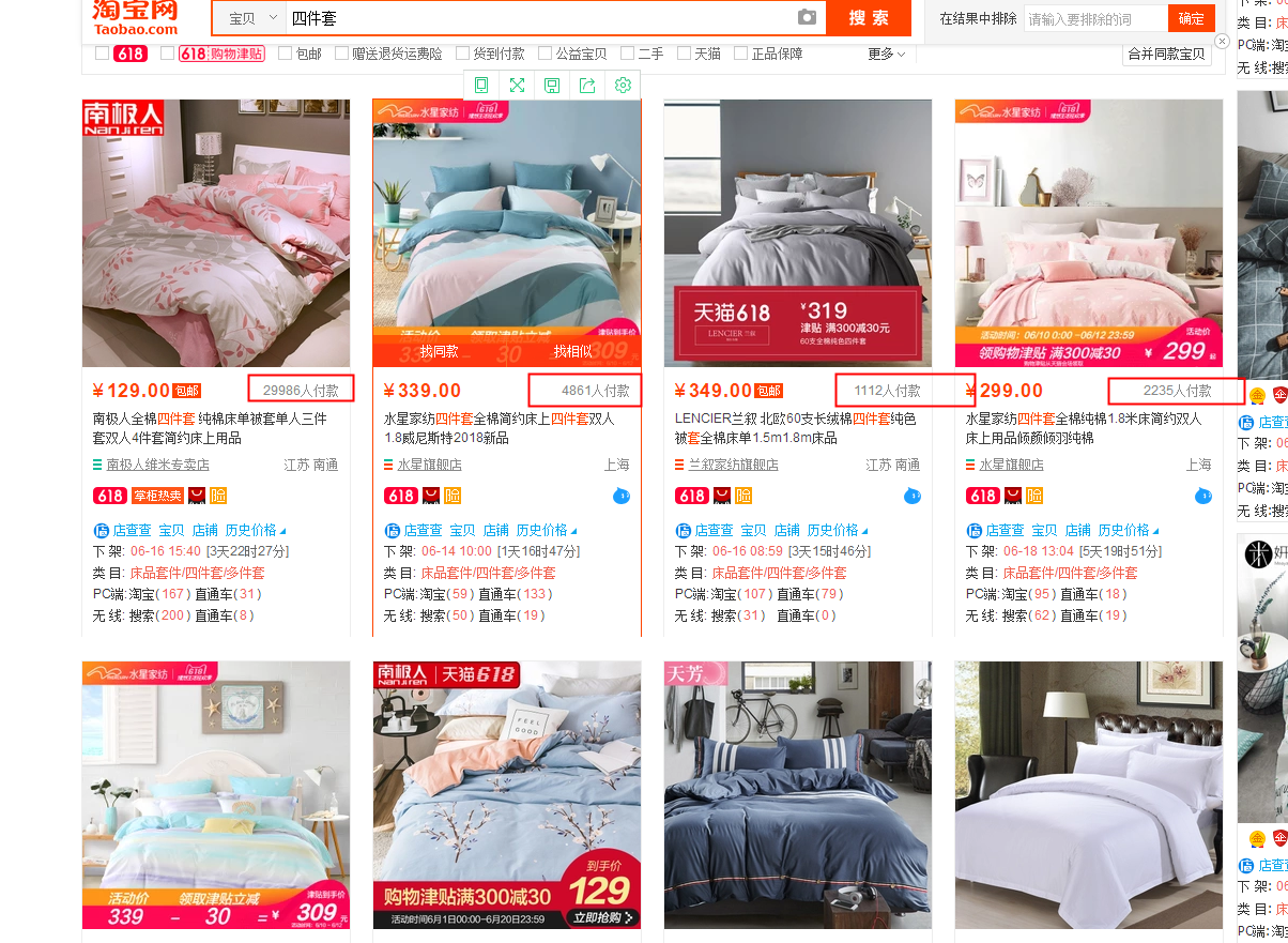 同样我们搜索四件套(大词)出现在前面的宝贝都是月销量上万,几千的宝贝,那么如果我们的宝贝标题用的都是大词,而且我们的宝贝基础权重很低,可想而知会排到多少页。所以在新品前期宁愿放弃搜索热度很高的词也要找到一些适合宝贝当下能够快速获得展现的蓝海词,才可以快速的突破。