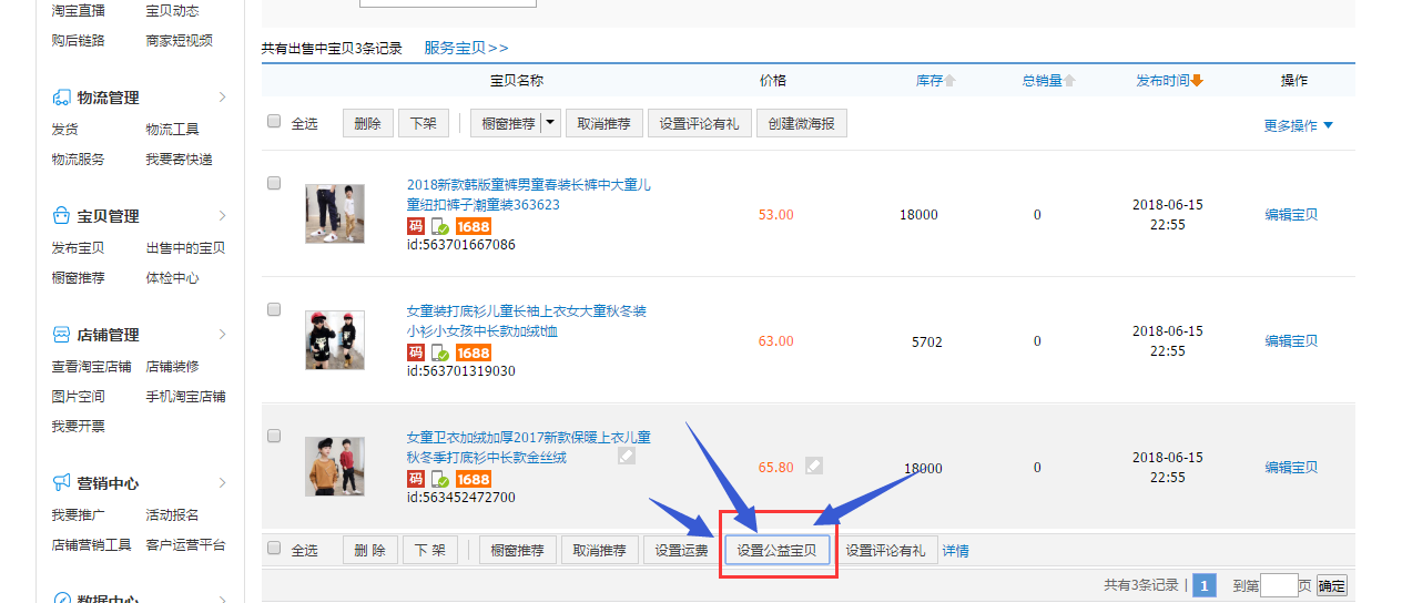 在卖家中心--出售中的宝贝--拉到最底端,勾选设置公益宝贝。